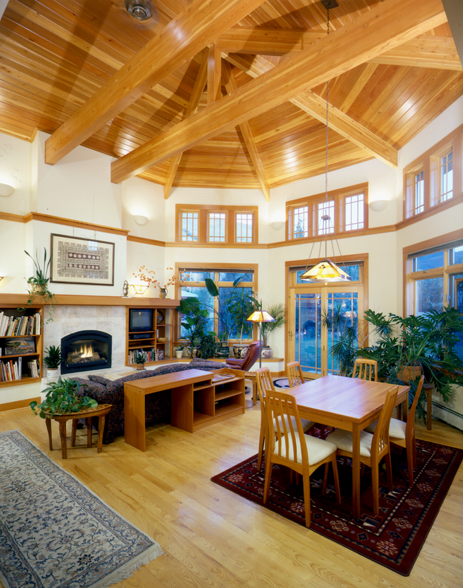 This existing home is located in the University area of Missoula where a developer built numerous single level ranch homes over the old University of Montana track. To remodel this home and still have it fit in with the historic context of the surroundings and its adjacent neighbors a mid-century Frank Lloyd Wright influenced design was used. Long horizontal lines with low hipped roofs connect this home to its site and minimize the scale and height of a significant second floor addition. The use of the existing brick with a new stucco finish further enhances the design intent. The interior architecture is equally distinct. The use of hardwood throughout the home creates a smooth transition when moving from room to room. Clerestory windows below fir ceiling beams bring in natural light emphasizing the spacious and lofty atmosphere. The design of vaulted ceiling in the great room creates a stunning focal point. The use of fir wood creates visual texture and interest. This home is an example of completely renovating and expanding an existing home yet blend with it existing architectural context.